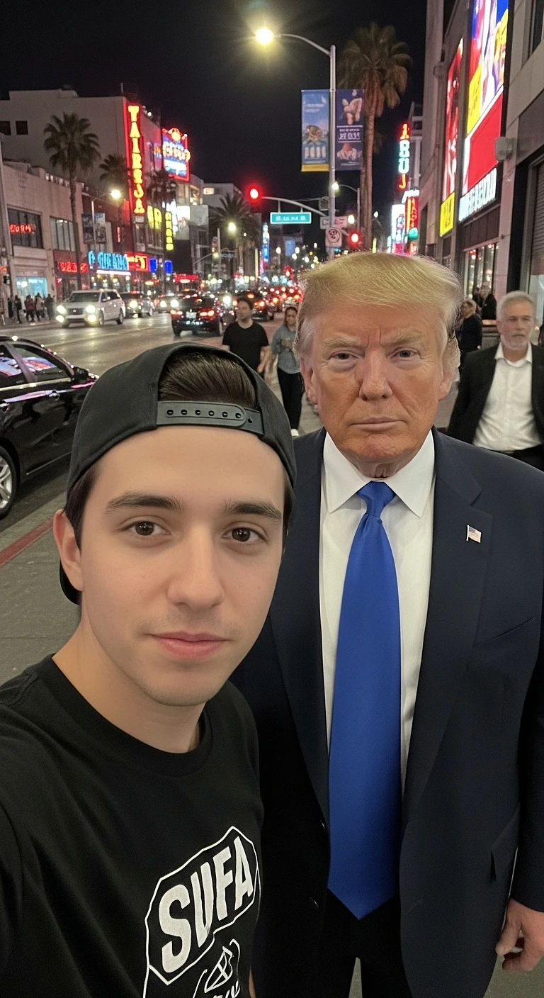 Gen photo of extremely ordinary and unremarkable iPhone selfie, with no clear subject or sense of composition — just a quick accidental snapshot. The photo has slight motion blur and uneven lighting from streetlights or indoor lamps, causing mild overexposure in some areas. The angle is awkward and the framing is messy, giving the picture a deliberately mediocre feel, as if it was taken absentmindedly while pulling the phone from a pocket. The main character is [uploaded person's face] , and Donald Trump stands next to him, both caught in a casual, imperfect moment. The background shows a lively Los Angeles street at night, with neon lights, traffic, and blurry figures passing by. The overall look is intentionally plain and random, capturing the authentic vibe of a poorly composed, spontaneous iPhone selfie. ar 9:16
