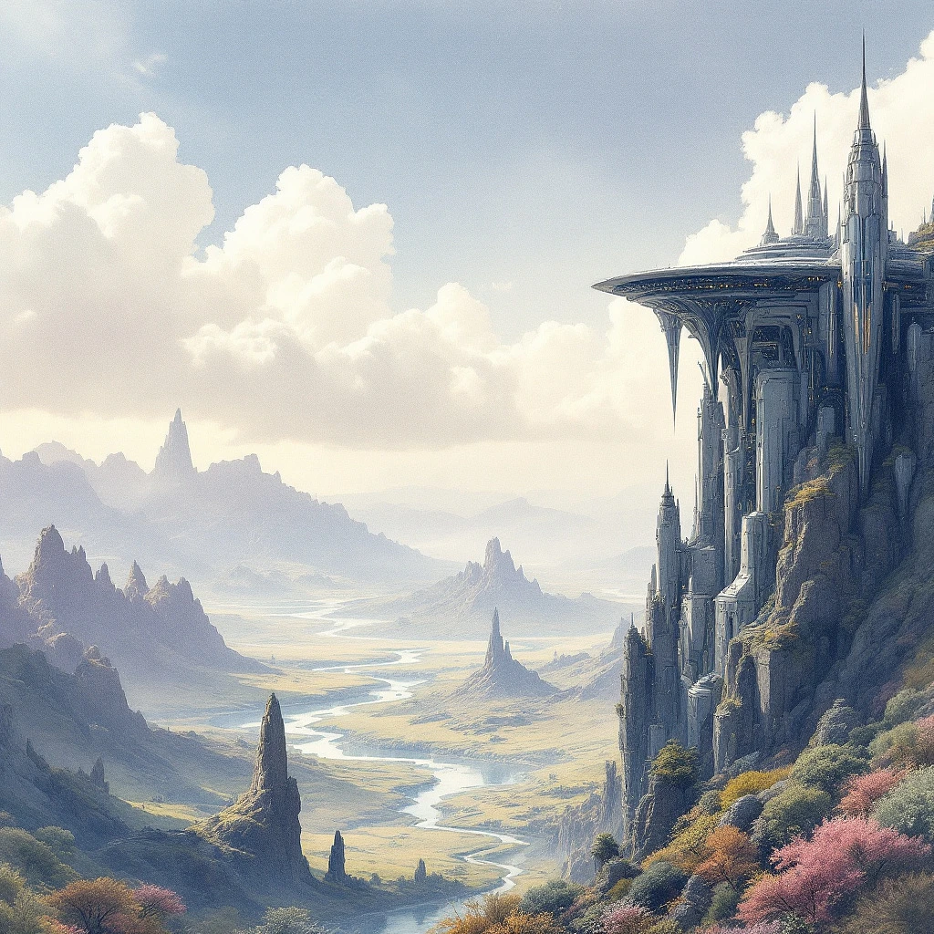 watercolor-style painting of an expansive sci-fi landscape featuring a futuristic castle perched on a towering cliff. The scene is bathed in soft, muted colors, creating a serene and otherworldly atmosphere. The vast landscape extends into the horizon, with alien flora, winding rivers, and a sky filled with ethereal, wispy clouds. The castle, with sleek, metallic spires and advanced architecture, harmonizes with the surrounding environment. The perspective is zoomed out, capturing the full grandeur of the scene and emphasizing the fluid brushstrokes characteristic of traditional watercolor paintings.