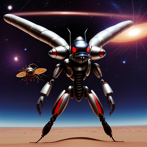 alien ant army group with silver ant armor invasion the planet, gunfire with red ant group, space starlight, desert background, plasma beams