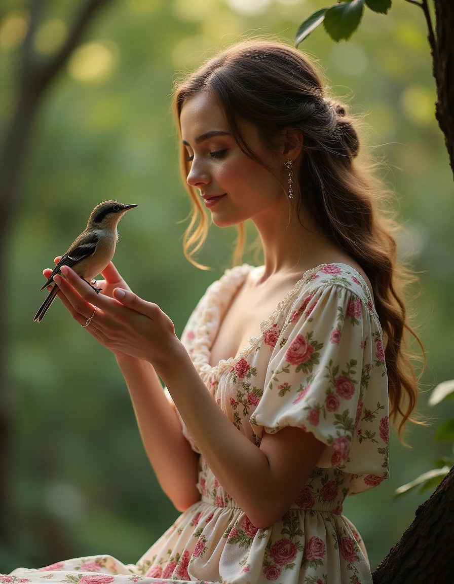 nature photography of a european woman with a floral dress, sitting on a branch and holding a small bird on her hand and tenderly looking at the bird
