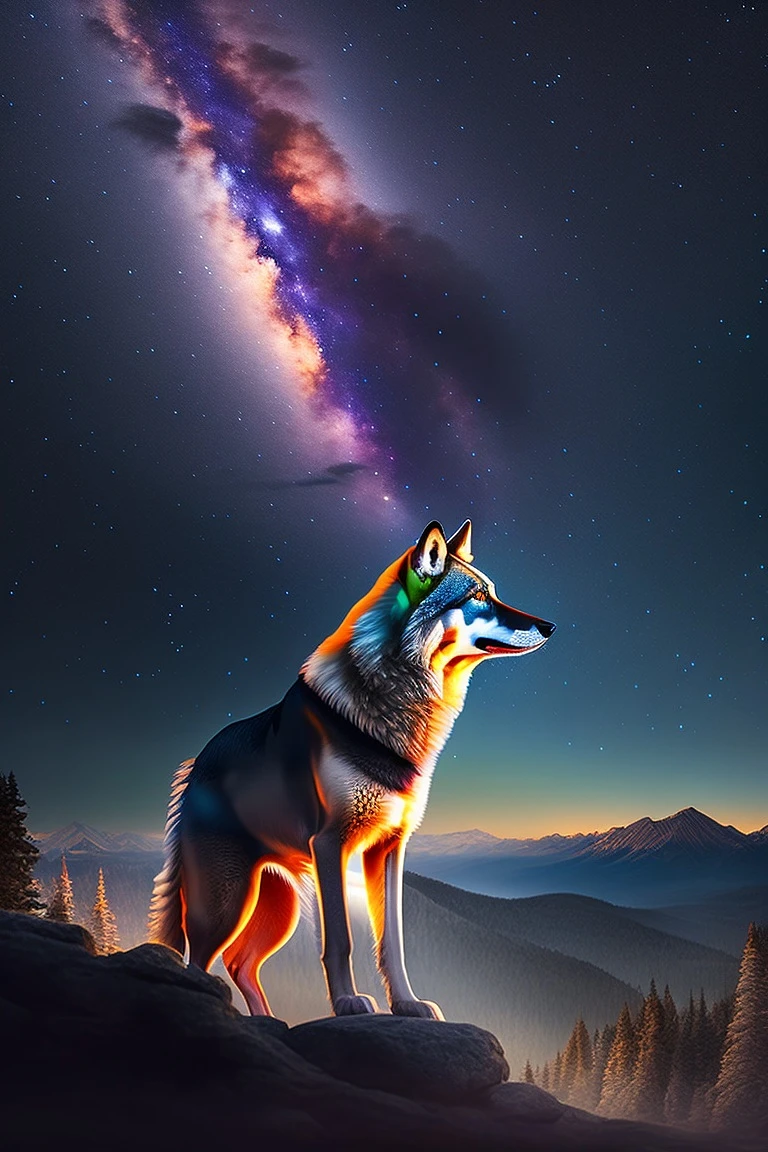 Night sky, sky full of stars , top of the mountain, forest area, wolf in the top of the mountain , hyperrealistic, photography, 4k