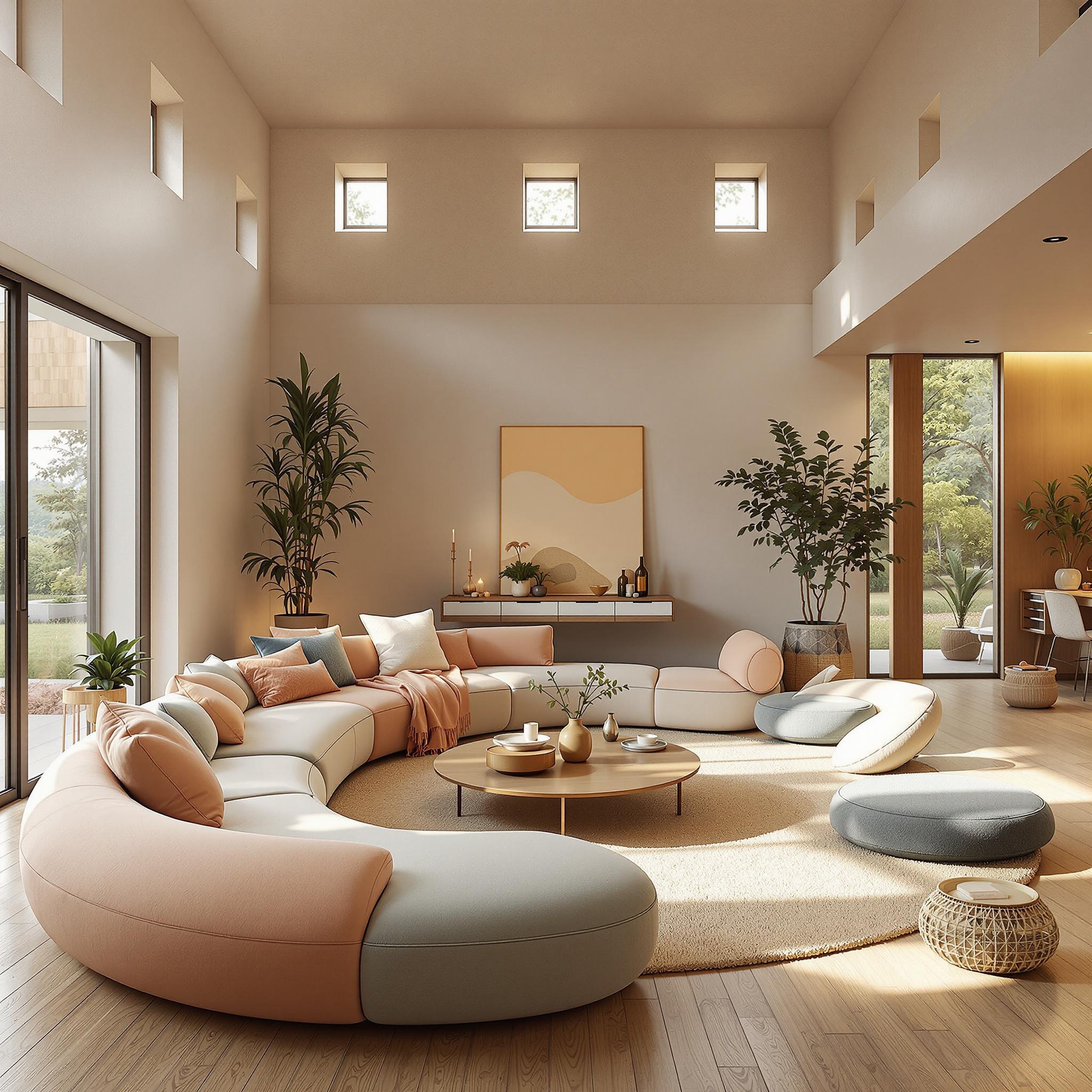 High resolution photography interior design, dreamy sunken living room conversation pit, wooden floor, small windows opening onto the garden, bauhaus furniture and decoration, high ceiling, beige blue salmon pastel palette, interior design magazine, cozy atmosphere; 8k, intricate detail, photorealistic, realistic light, wide angle, kinkfolk photography, A+D architecture