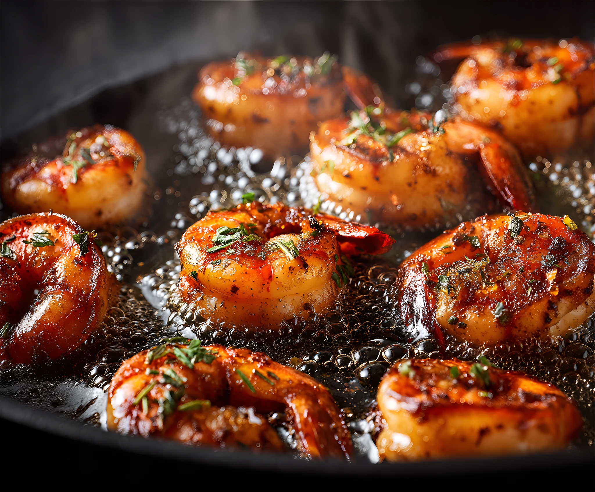several pieces of cooked shrimp in a dark-colored skillet, golden-brown and crispy, with visible herbs and spices on the surface, slight steam rising from the hot oil, focused on the shrimp's texture and the cooking process, high-key lighting highlighting the food's rich color and details, shallow depth of field, realistic lighting and cooking effects, detailed view of the bubbling oil, focus on the shrimp, rich golden-brown hue of the shrimp, a multitude of small bubbles in the oil, showing the cooking process, high resolution.