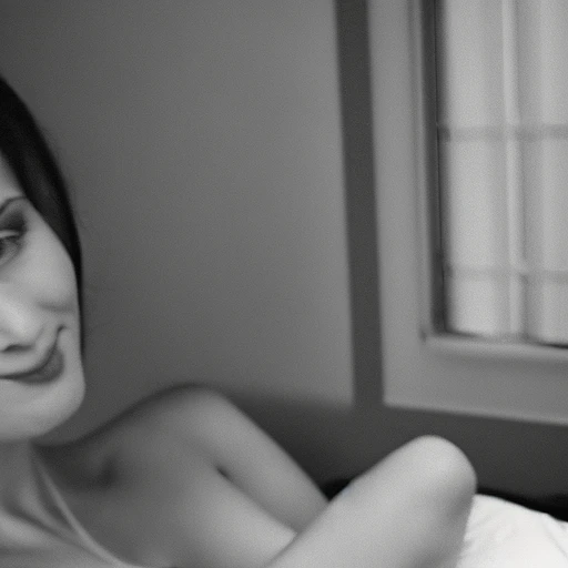 Whole body photo of a gorgeous lady wearing skimpy nighties on the bed, seductive smile, daytime, deep photography, Ilford HP5 film, b&w, crushed blacks, depth of field, dark photo, film grain, shadows, natural light, shot with Sony FE 70-200mm f/2. 8 GM OSS lens, natural light