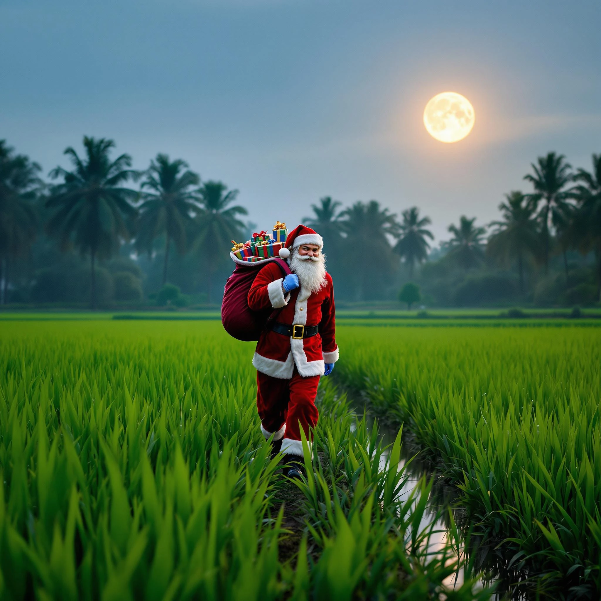 Photograph of a Santa Claus, carrying a sack of gifts, strolls through a serene Kerala paddy field under the glow of a full moon. The familiar figure contrasts beautifully against the lush green backdrop, his traditional red and white attire shining in the moonlight. The scene captures the magic of Christmas and the enchanting beauty of nature. Rich, vibrant colors and intricate textures bring this heartwarming image to life, evoking a sense of wonder and joy. Shot on canon 5d mark 4