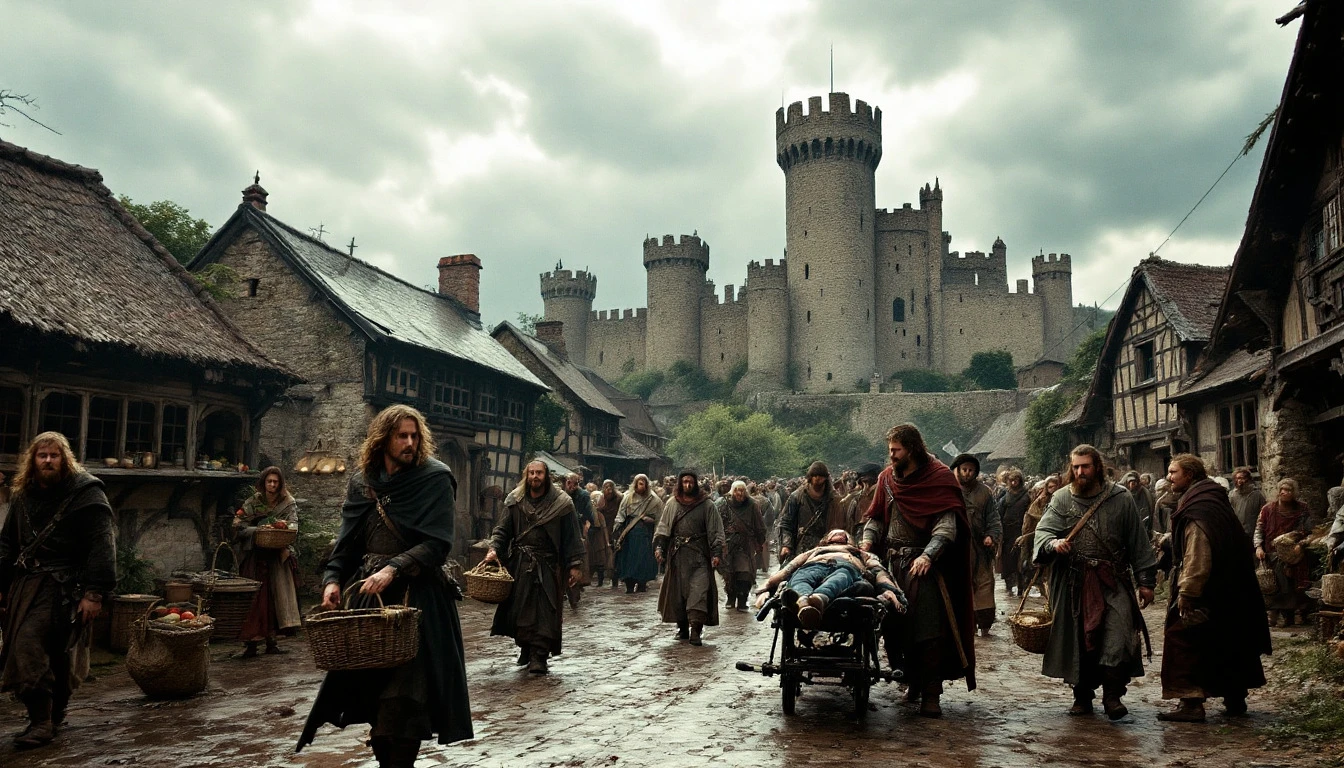a medieval village with a castle in the background, showcasing a scene of everyday life in a bygone era. The villagers are dressed in attire typical of the medieval period, with tunics, cloaks, and hats, and some are carrying various items such as baskets, tools, and a stretcher with a wounded person. The castle looms in the background, its stone walls and towers a testament to its grandeur and importance. The sky above is cloudy and foreboding, with a sense of drama and tension. The wide-angle camera perspective captures the entire scene, from the villagers in the foreground to the castle in the background, creating a sense of depth and context.