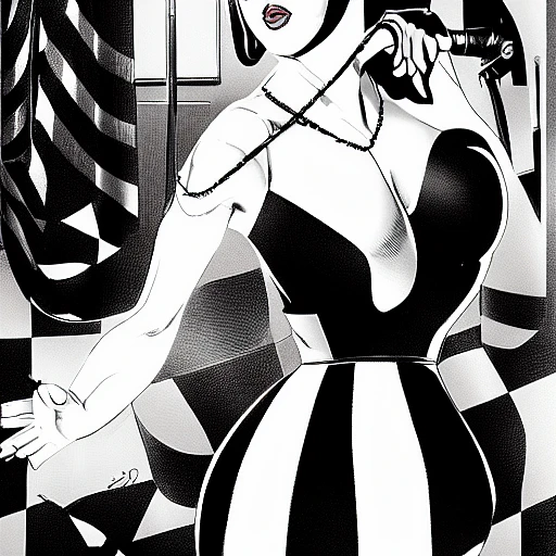 beautiful woman pinup, black and white in the style of alex ross, wearing a tight black dress, black hair ponytail, kitchen with black and white checkered floor in the background, 2 d, 4 k, unreal, intricate, digital painting, highly detailed, artstation, sharp focus, illustration,