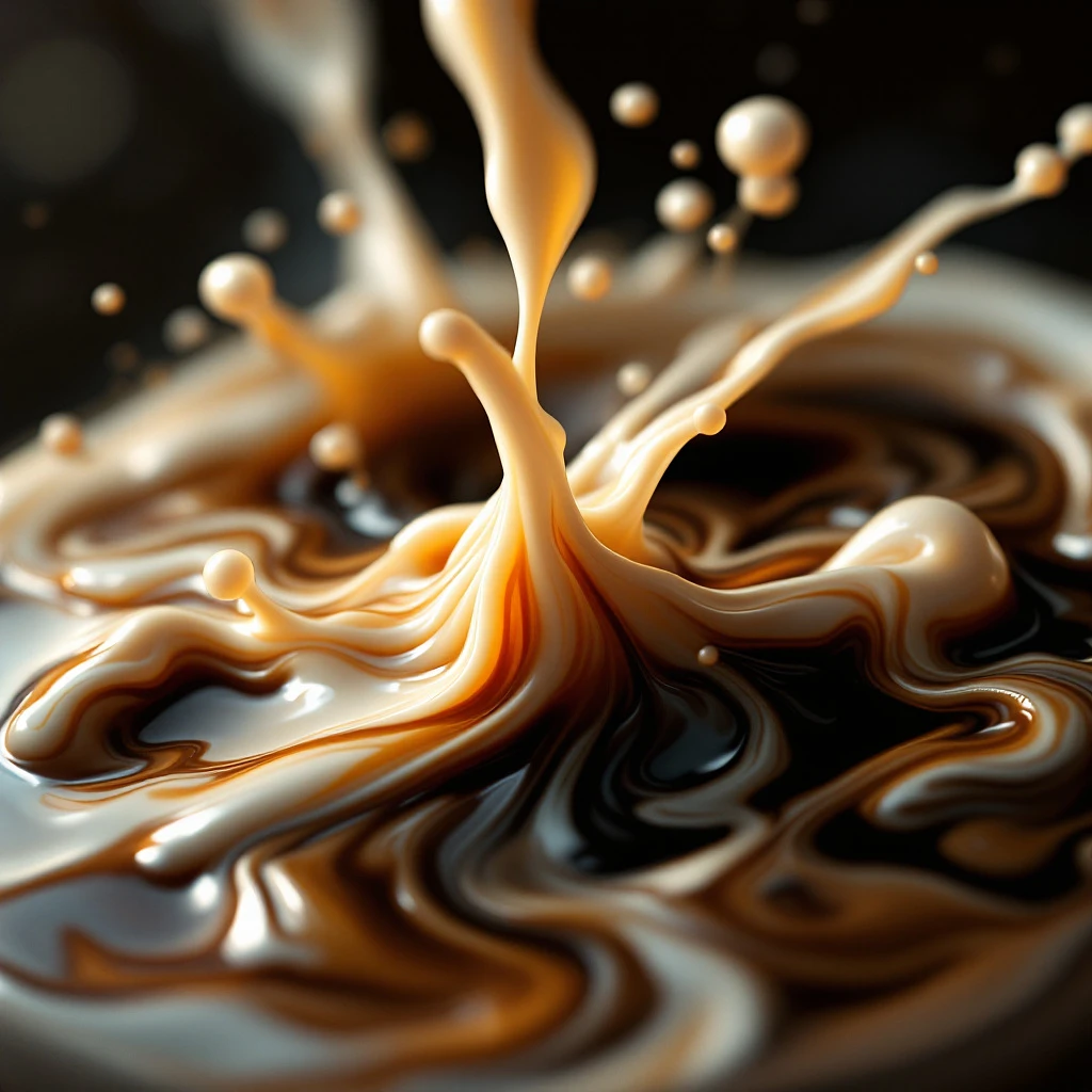 The video presents a breathtaking HDR-enhanced close-up of coffee and cream blending together in a cup, captured in ultra-slow motion. Bright, vibrant lighting highlights the suspended droplets of cream as they cascade into the rich, dark coffee, creating intricate, swirling patterns with stunning clarity. The interplay of light and shadow accentuates the silky textures and dynamic contrast between the two liquids, adding depth and realism. Each motion is fluid and captivating, with the bright HDR imagery bringing out every detail, from the glossy surface of the coffee to the delicate marbling of the cream. The result is a visually striking and artful portrayal of this everyday moment, transformed into a luminous masterpiece.