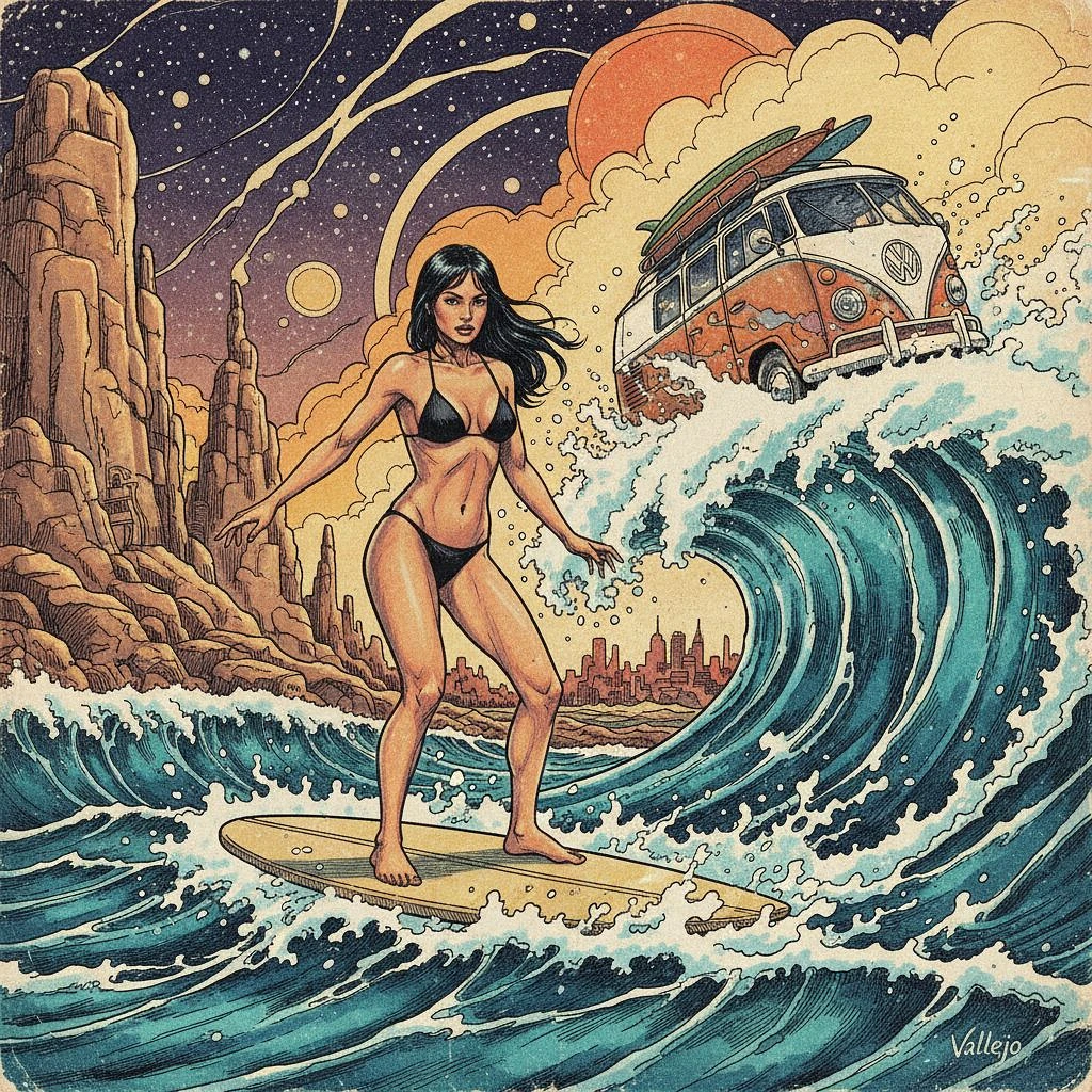 Comic book realistic illustration, full body shot of a young gorgeous Brazilian woman with a thin aesthetic physique, holding a round surfboard the woman is wearing ultra small black bikini , she is in an giant waves , surfing with a classic vw buson, high detail, by Boris Vallejo, hand-draw, handmade drawing using color ink pen, brushes style using cross-hatching for shadows, high details, hand drawn, in the form of an old drawing, extremely detailed background, in the style of Moebius, Metal Hurlant, Heavy Metal comic, full color, grain effects, film effects --ar 4:5 --sref 3171008199 --profile ort49sp --stylize 1000 --niji 6