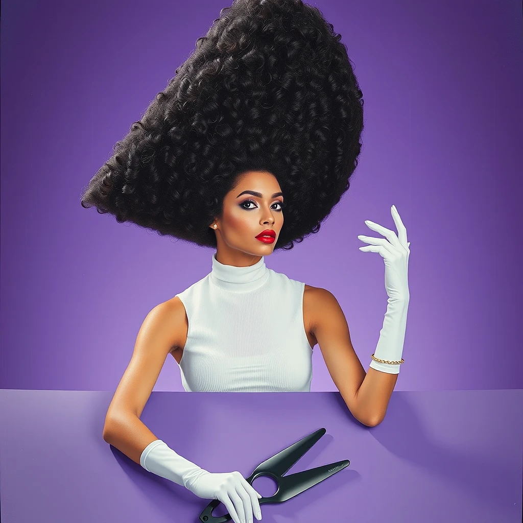 The image is a digital illustration of a woman with a large afro hairstyle. She is wearing a white sleeveless top and white gloves. The woman is sitting at a purple table with a pair of scissors in front of her. The background is a solid purple color. She has a serious expression on her face and is looking directly at the camera. Her hair is styled in a voluminous, curly afro that cascades over her shoulders. The overall mood of the image is dramatic and glamorous.
