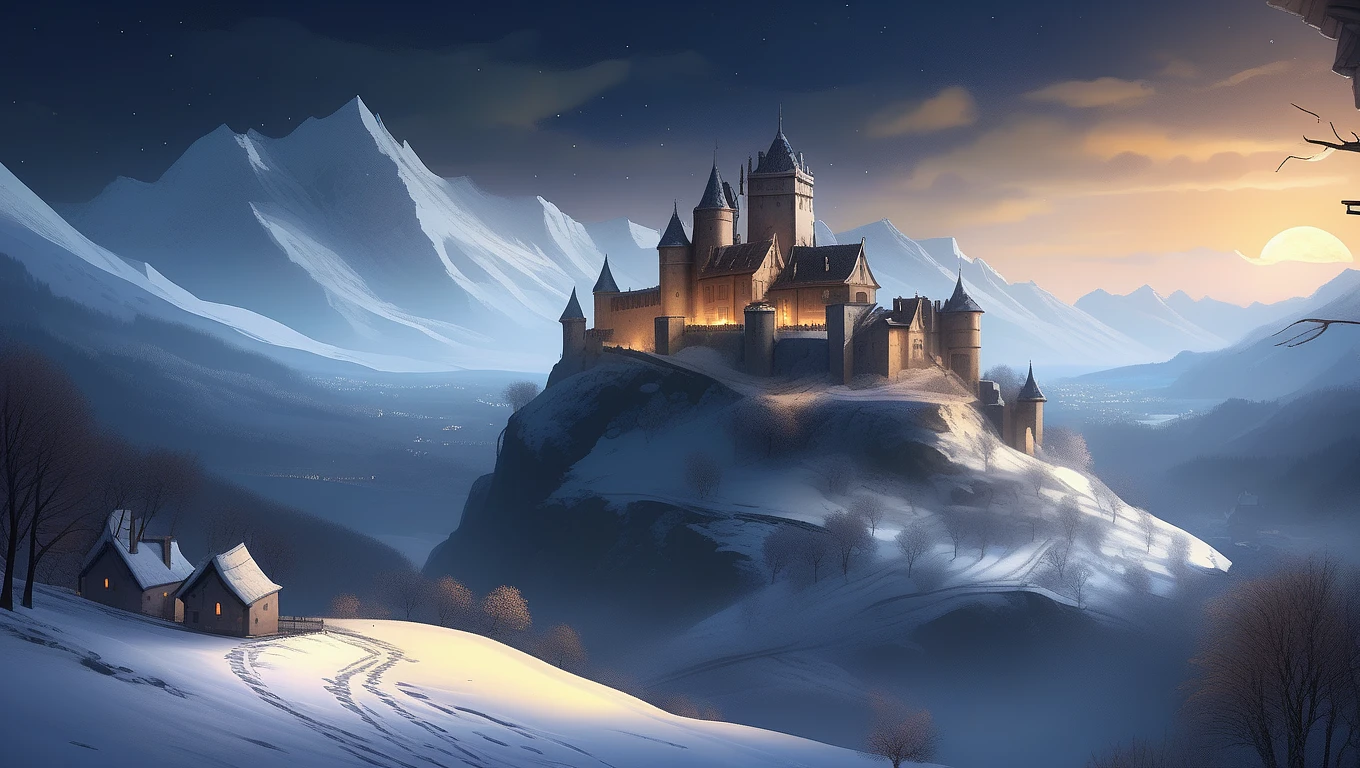 a castle sitting on top of a snow covered mountain, inspired by Raphael Lacoste, medieval village on the plains, wintry rumpelstiltskin, full res, ingame image, wallpaper, cliffside town, highdetailed, winter storm, thomas kincade, concept illustartion, tuomas korpi and wlop, concept art, night time, mesmerizing night sky full of stars