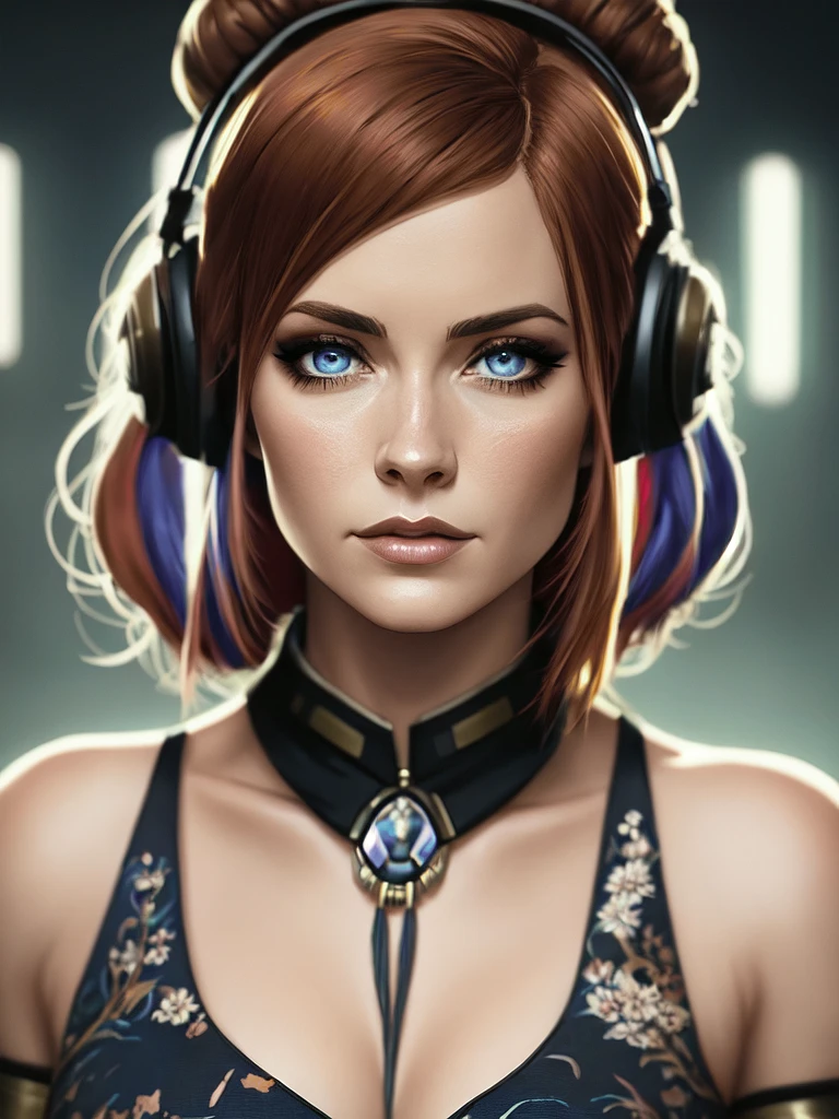 1 girl, [Becky Lynch|Avril Lavigne] as Leia Organa with colored inner hair, mute colors , stunning eyes, amazing eyes, sitting on person, Single wing , elaborate dress, one piece character, simetric body, full body, extremely detailed, cinematic lighting, high contrast, artstation, Illustration, Portrait, Oil Painting, John Blanche, Norman Ackroyd
