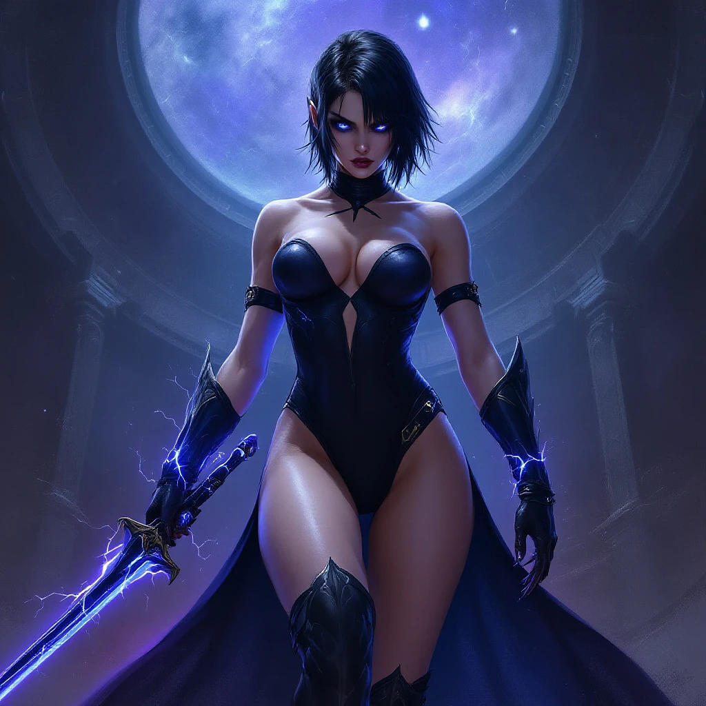 simple digital painting in the style of warhammer 40k of a female psyker, standing infront a gothic circh, holding a sabre with blue lightning, cybereyes, black ultra tight onepiece bathsuit, black sidecut hair, huge tits