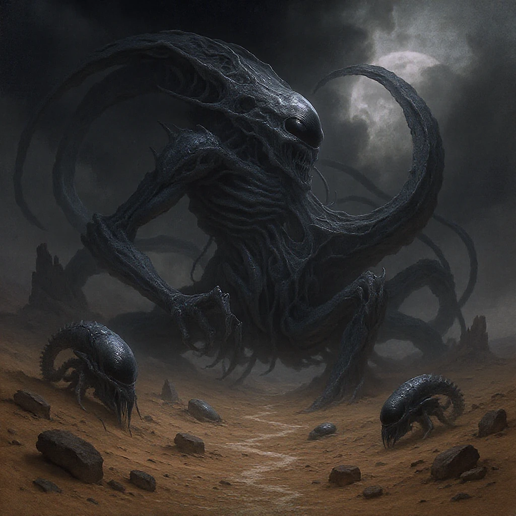 Centered image. 400 pixels. In the style of HR Giger with his dark, biomechanical structures and his aliens in a desert environment.