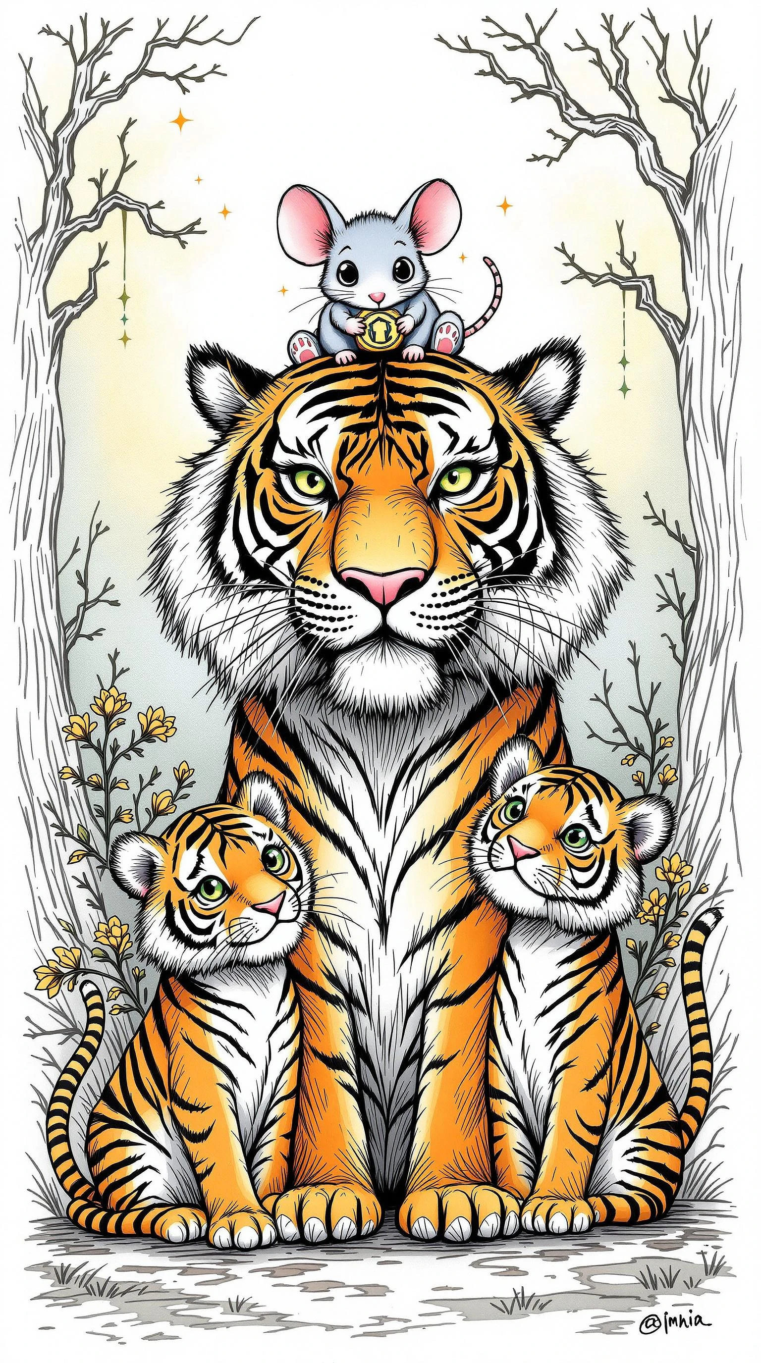Doodle Art, a tiger and two tiger cubs, and a oversized mouse , with a mouse on the tiger's head, the mouse holding a talisman,