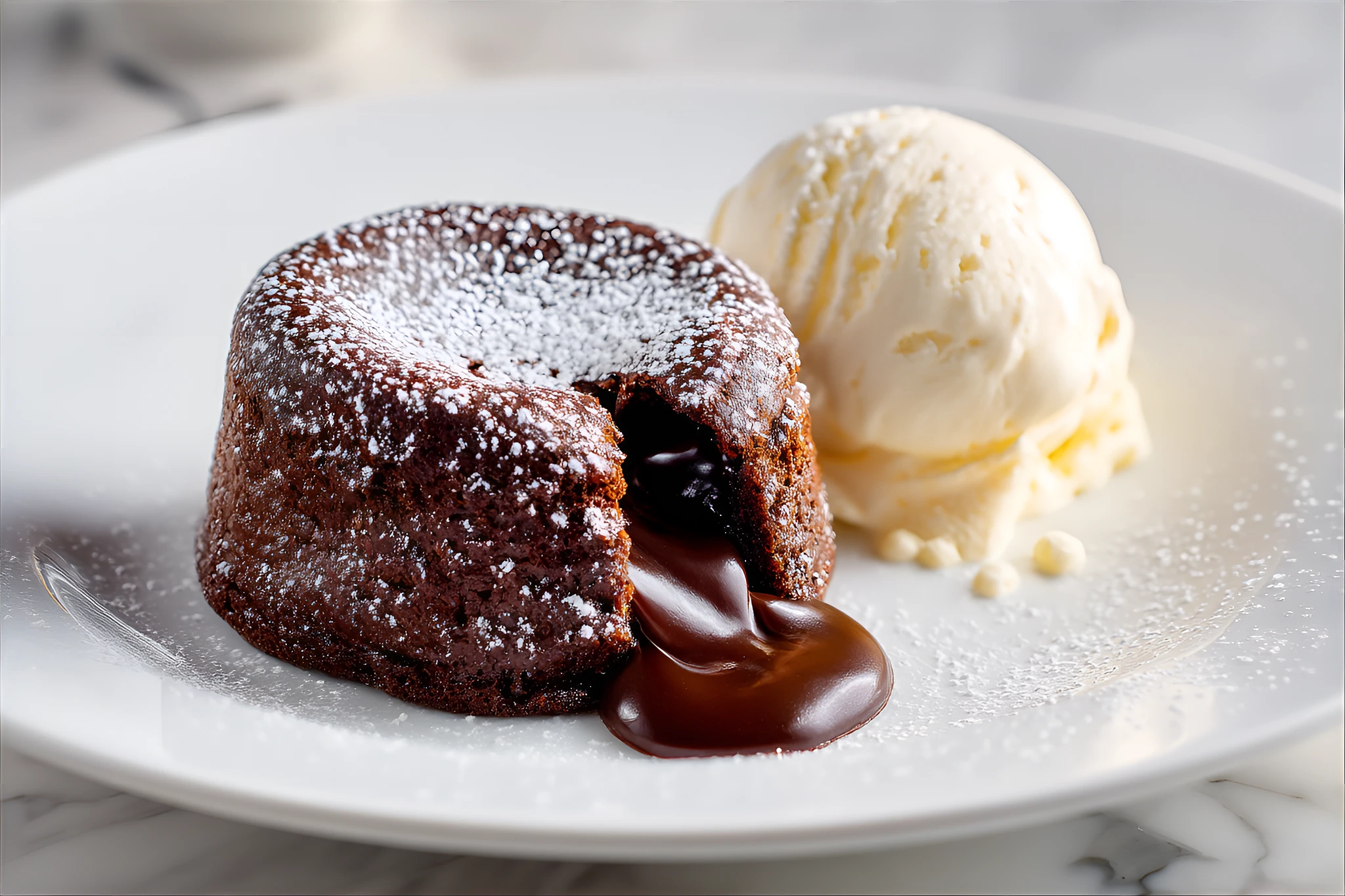 decadent chocolate lava cake on a pristine white plate, placed delicately on a marble countertop. The cake oozes rich, molten chocolate from its center, dusted with a light sprinkle of powdered sugar and accompanied by a scoop of creamy vanilla bean ice cream. The plate sits