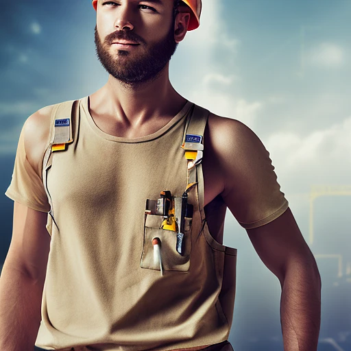 builder at work, men, builder work uniform, builder at work, men, Mood: serenity; atmosphere peaceful; fashion photography; detailed skin; beautiful eyes; incredible body composition --ar 2:3 --s 750