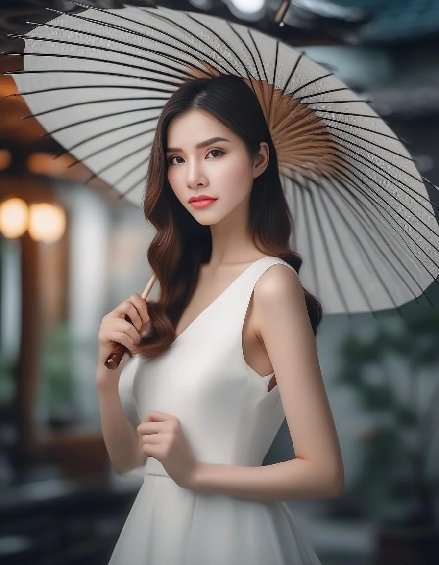 solo, beautiful girl, umblrella, long hair, full body, holding, dress, holding umbrella, oil paper umbrella, black footwater, standing, hair ornament