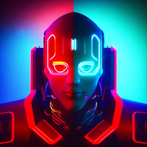 Profile picture of a cyberpunk bot, red left side, blue right side, neon, 4k, high contrast