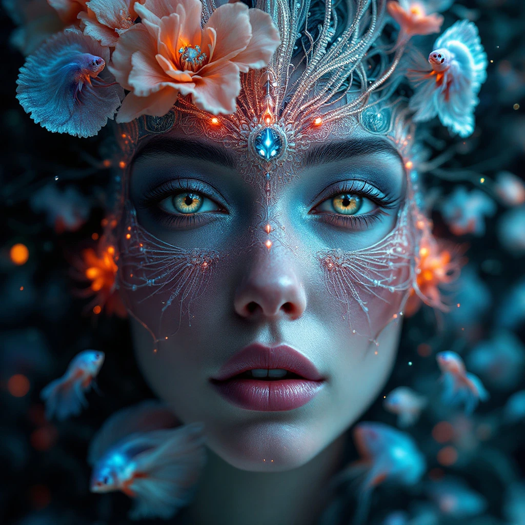 Goddess close-up portrait ribcagel. jellyfish phoenix head, nautilus, orchid, skull, betta fish, bioluminiscent creatures, intricate artwork . octane render, trending on artstation, t symmetrical artwork. cinematic, hyper realism, high detail, octane render, 8k