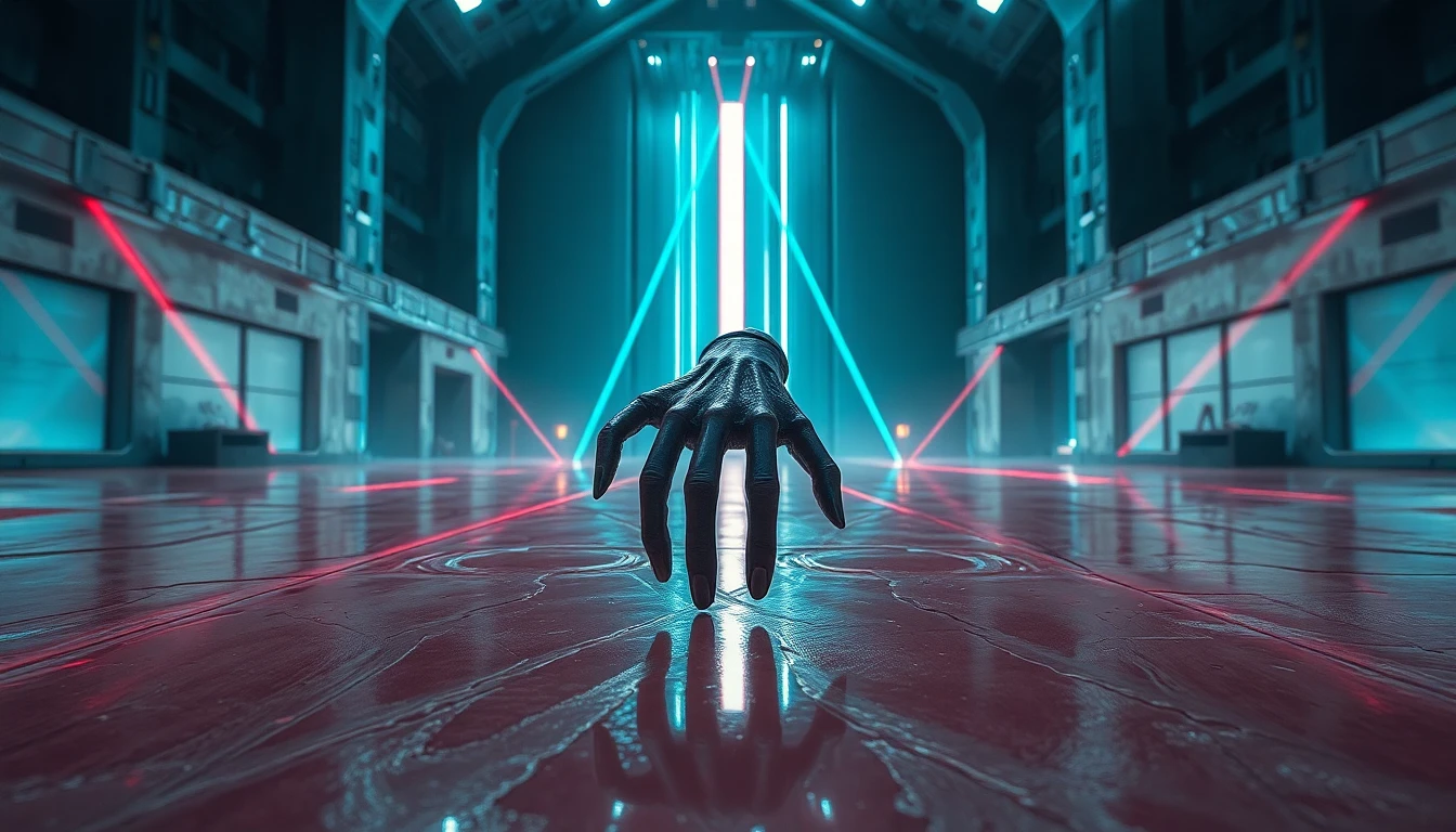 In the foreground, a disembodied humanoid hand with seven fingers crawls across the oily shiny floor of a large futuristic brutalist building. The building has strange digital lighting, shafts of coloured laser beams in geometric patterns cross the space. A science fiction style scene. Strange modality of futuristic visions. In the style of Kati Horna. Macabre, surreal. Epic cinematic futuristic dystopian. Photorealistic, hyper-detailed.