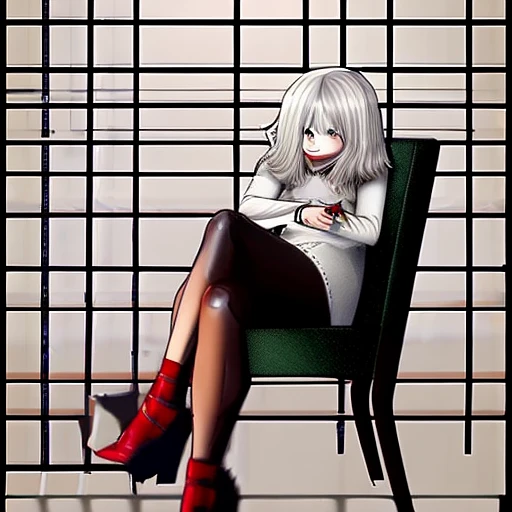 anime, woman, white hair, bob cut, blue eyes, freckles, red lips, white sweater, tight sweater, short leather jacket, brown leather jacket, black tight skirt, black high heels, sitting on a chair