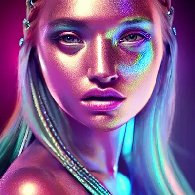 hyper realistic photo of chrome metal girl face. 8k, hd, ai, full pink lips, beautiful face, neon purple flowing hair, mystical, dark gothic, stunning, dreamy, ethereal, tyra banks, elegant, ornate, luxury, midjourney, cgsociety, style of james jean, Tom bagshaw, Roberto Ferri and Marco Mazzoni, hyper-realistic, enhanced :: neon dress made of flora, carved angels and deities , female alien supermodel, hyper detailed eyes, long thick lashes, insanely detailed and intricate, Mandelbulb fractal, photoreal, photoshoot, persian rug, art nouveau architecture :: dreamy, cinematic lighting, Marc Simonetti, Patrick Turner, multiverse, Peter Mohrbacher, insanely detailed and intricate, golden ratio, elegant, ornate, luxury, elite, ominous, line details, visionary art, matte painting, cinematic, cgsociety, James jean, Brian froud, ross tran, trending on artstation, pierre auguste renoir, beautiful highly detailed --ar 1:2 --beta --upbeta --upbeta, deviant art, trending on ArtStation , symmetry