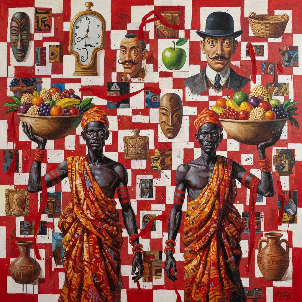 A painting of two African men in traditional carrying food, with the background being an abstract collage made from red and white squares, including images representing historical figures such as Dali, Magritte, and African crafts, with red fabric woven into it and red stripes on their . The overall style is very colorful and expressive. It's a vibrant scene that captures attention.