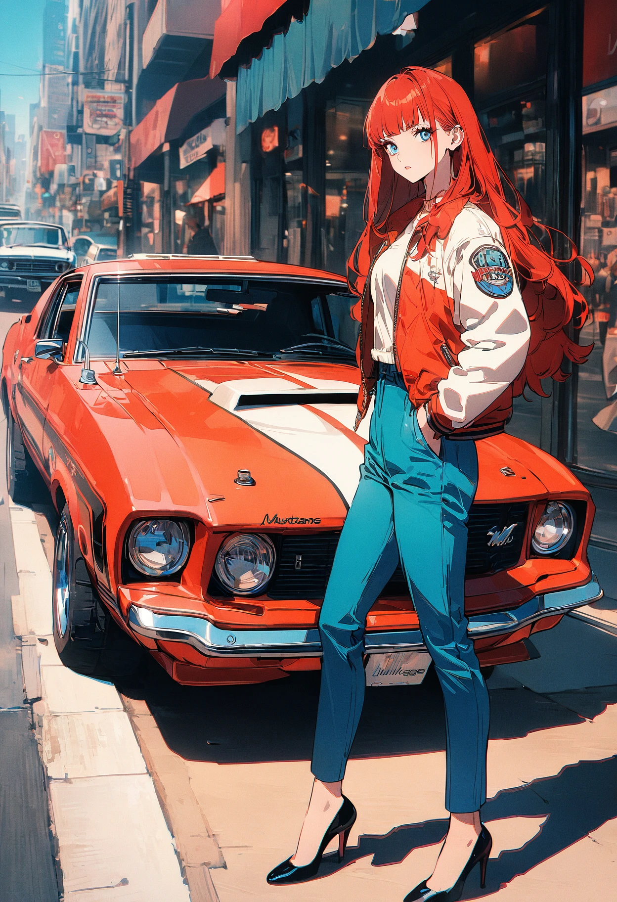 1girl, intense crimson hair, long straight hair, shaggy cut, bangs, detailed eyes, blue marine eyes, beautiful eyes, makeup, eye liner, one piece suit, 80s style, standing, hands in pocket, high heels, gorgeous, stunning, looking at viewer, 1980 ford mustang, red and black, city, street, vintage style, warm colors, 8k, ultra detailed, masterpiece, best quality, absurdes