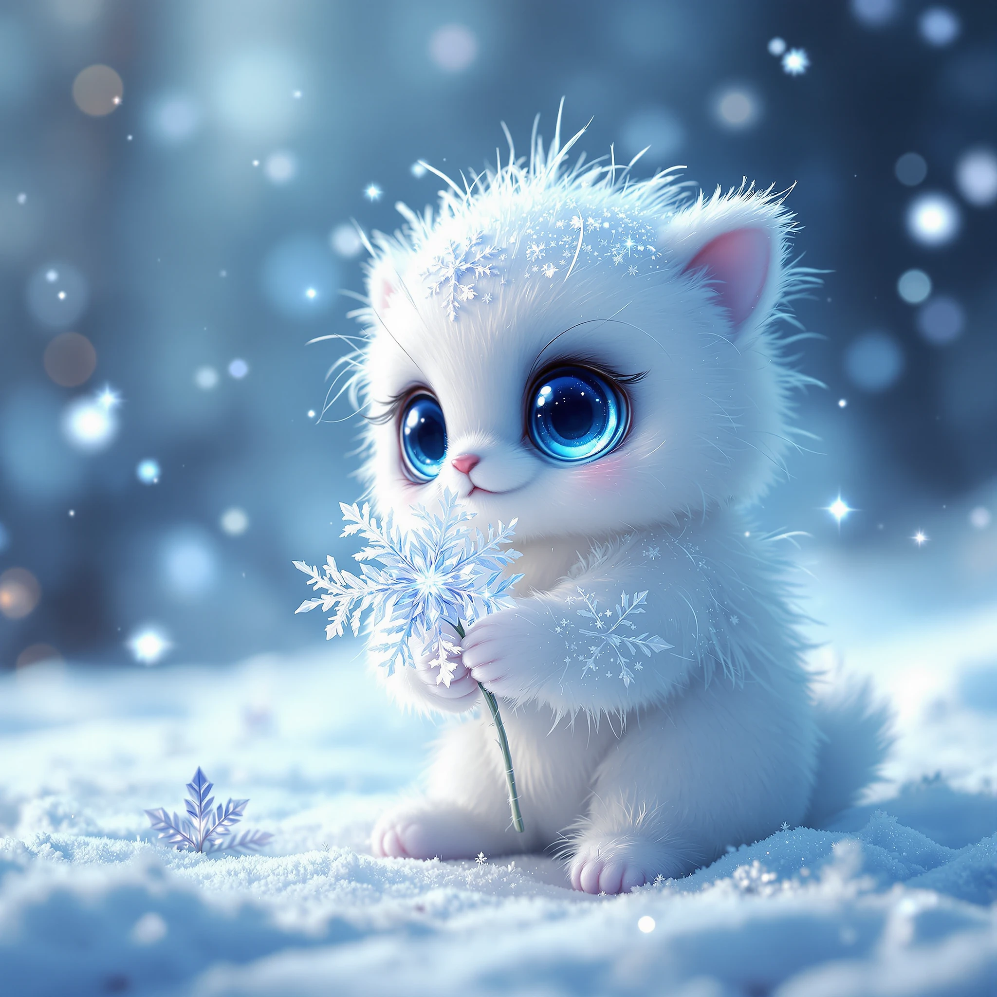 A small, adorable, fluffy, anthropomorphic winter creature with large, expressive, and luminous icy-blue eyes. Its soft, snow-like fur is detailed with frost and icicles, giving it a magical, otherworldly appearance. The creature gently holds a delicate frosted flower, glowing faintly in the icy air, with intricate crystalline details on its petals. The background is an ethereal snowy environment, with a mystical, cold atmosphere featuring softly falling snow and sparkling frost particles suspended in the air. The lighting is cool and luminous, creating a dreamy, winter wonderland effect, emphasizing the enchanting and innocent essence of the creature.