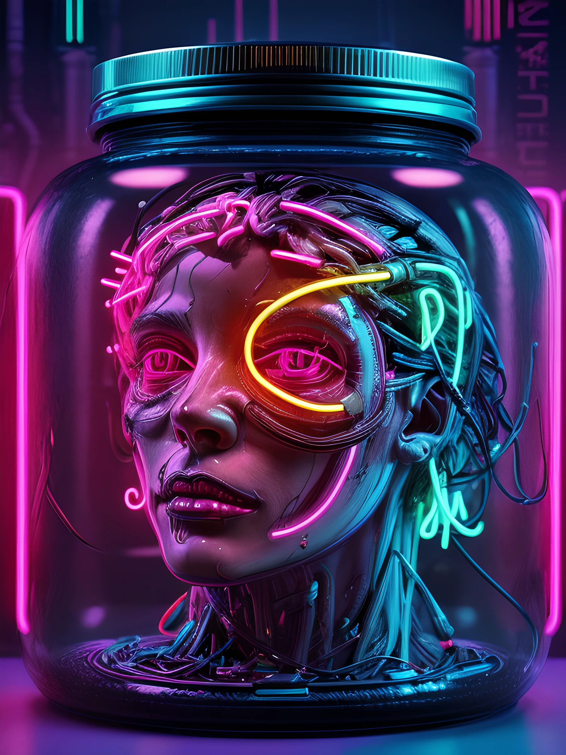 neonpunk style, a human brain, growing in a jar, surrealist, neon, vibes, vibrant, stunningly beautiful, crisp, detailed, sleek, ultramodern, high contrast, cinematic, ultra detailed, intricate, professional, <lora:add_detail:1> , <lora:detail_slider_v4:1>