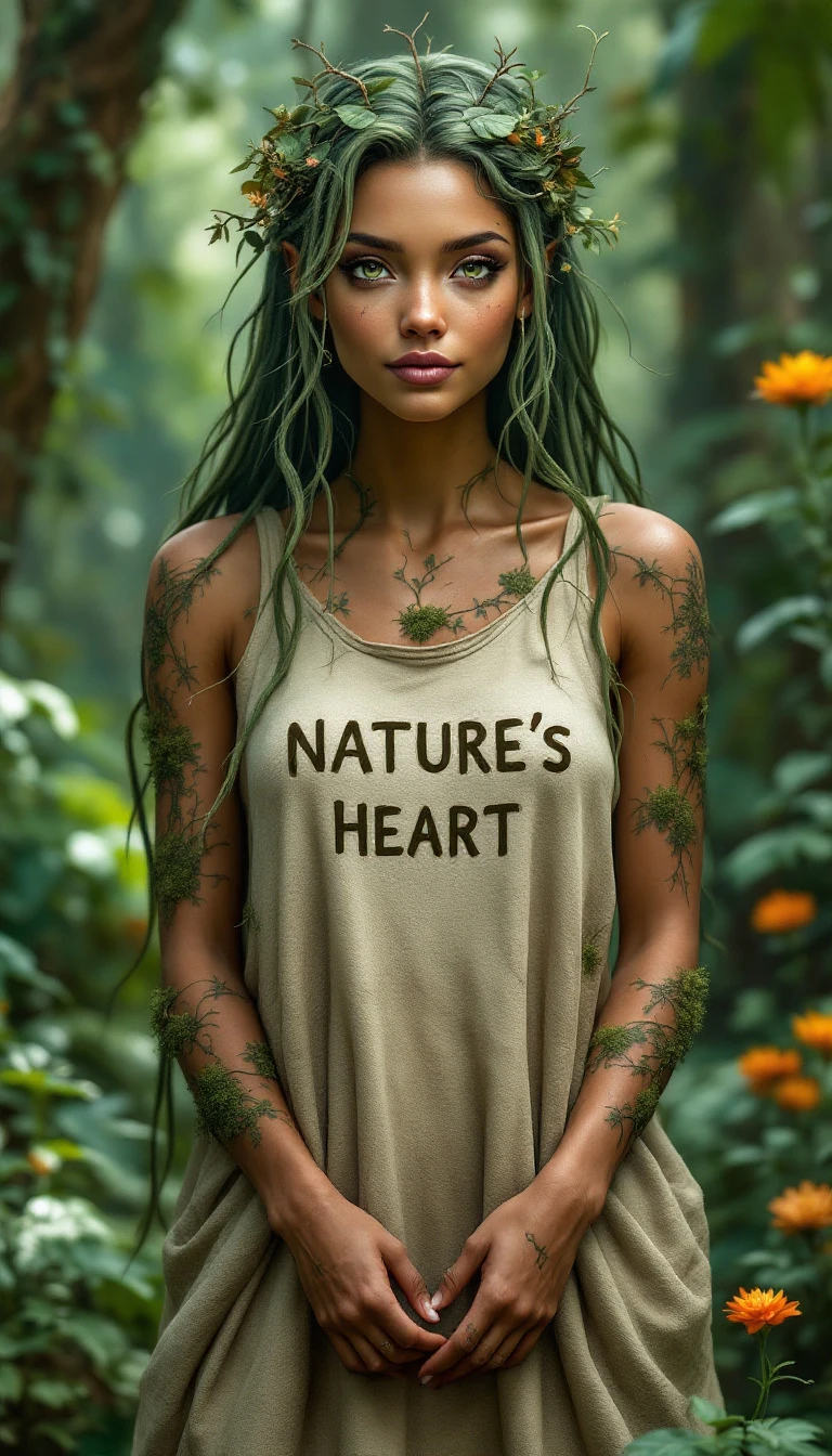A hyper-realistic portrait of a female plant elemental with bark skin and long, leafy green hair, styled with intertwined vines and cascading branches. She has large, luminous green eyes that radiate warmth and life, with a nurturing gaze. Her facial expression is tranquil yet powerful. She wears a loose-fitting, sleeveless earth-toned dress that reads "NATURE'S HEART" across the chest. Her body has a strong, rooted build, with gentle curves, and her hands are softly cradling a small flower. The plant elemental has small moss and flower markings on her body, adding to her earthy appearance. The background is a lush forest with vibrant flora and botanical crowns. The texture of the dress should be soft and organic, resembling linen or cotton. Her skin and hair display a woody texture.