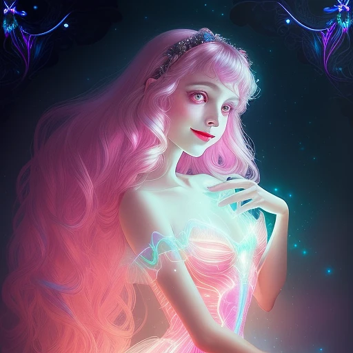 Hologram, bioluminescent dress made of bright glowing colorful fairy lights, moonlit night background, neon glow. Delicate beauty, lovely smile, sharp red lips, dreamlike fairytale, rococo, soft pastel colors, Tim Burton, Coby Whitmore, Edmund Dulac, Fragonard, highly detailed, dainty, perfect long hair.