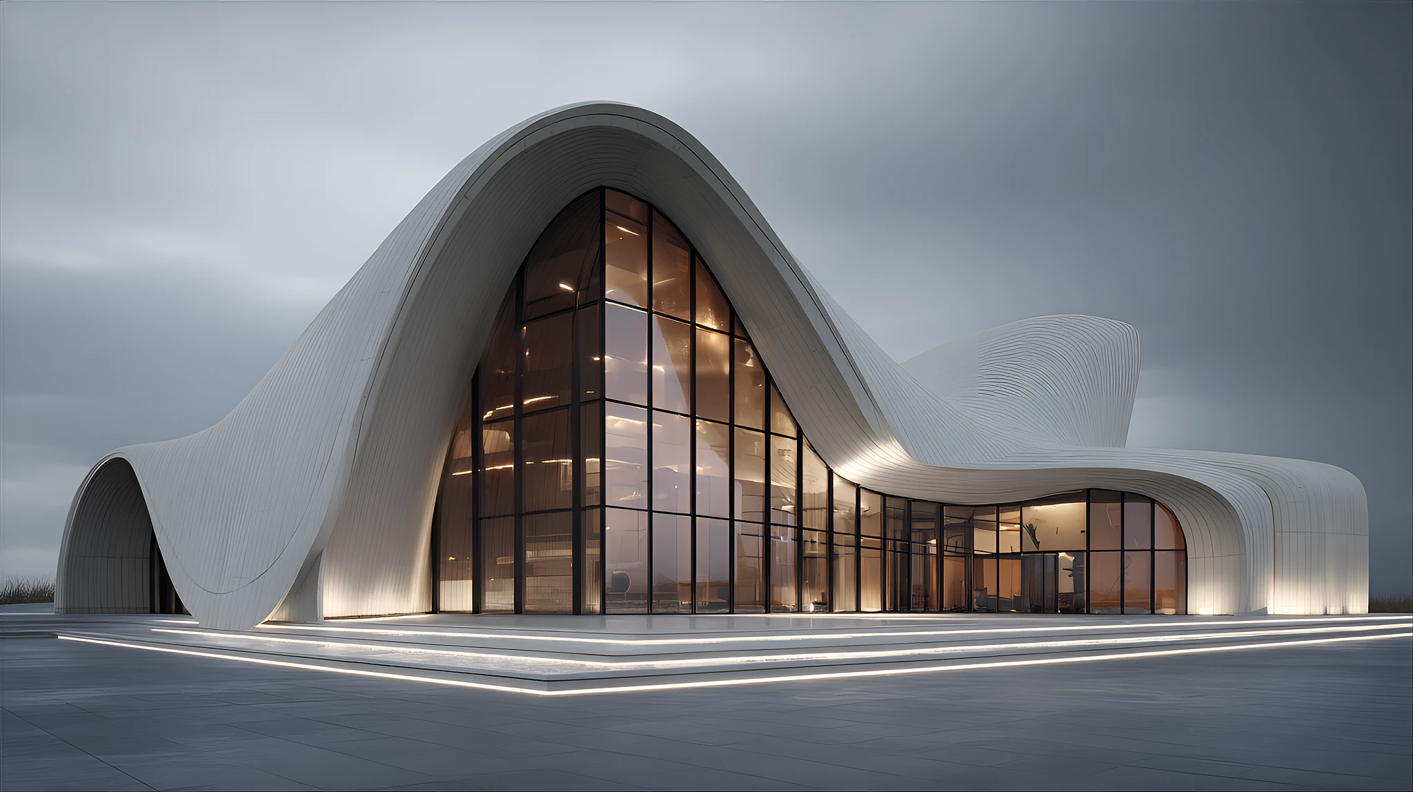 Modernist architectural building, exterior shot, large sweeping curves of white concrete facade, smooth, flowing forms, large bronze-toned glass panels reflecting ambient light, a series of tiered platforms leading up to the structure, dark gray pavement, cloudy overcast sky, low-angle, wide shot, detailed surface textures, minimal shadows, contemporary style, architectural photography, urban landscape, detailed perspective, smooth concrete, large windows, modern design, sophisticated, calm atmosphere