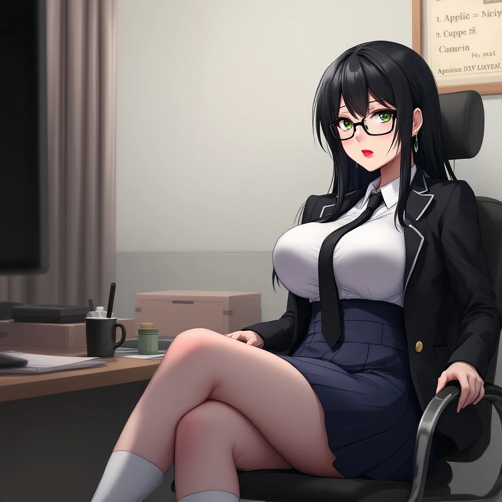 anime, woman, black hair, long hair, green eyes, black glasses, red lips, white shirt, black tie, black blazers, short dark blue skirt, highschool skirt, white socks, black shoes, standing at an office, bored expression, big chest, sitting on a chair, sitting with legs crossed