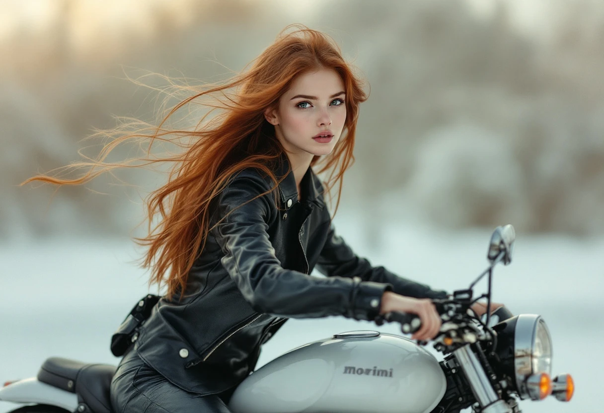 Create a beautiful red-haired teenager riding a Moto Morini, an Italian motorcycle. She is adorned in Moto Chic leather clothing. Her long hair flows freely in the wind. Side view, facing the camera in an elegant and dreamy composition with a pastel color palette dominated by soft whites, light blues and muted beige tones. Highlight elements, ethereal lighting and a serene, minimalist aesthetic. Include delicate textures, reflective surfaces and a soft, misty environment for a magical, sophisticated and surreal feel. Emphasize soft, polished details and an overall sense of tranquility and wonder