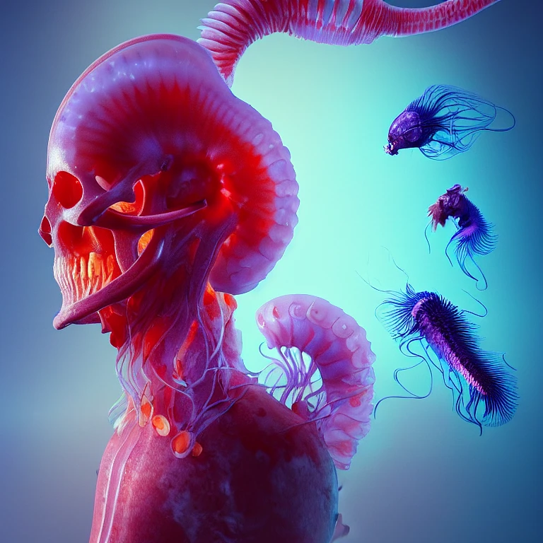 human thorax, jellyfish phoenix head, nautilus, orchid, skull, betta fish, bioluminiscent creatures, intricate artwork by Tooth Wu and wlop and beeple. octane render, trending on artstation, greg rutkowski very coherent symmetrical artwork. cinematic, hyper realism, high detail, octane render, 8k