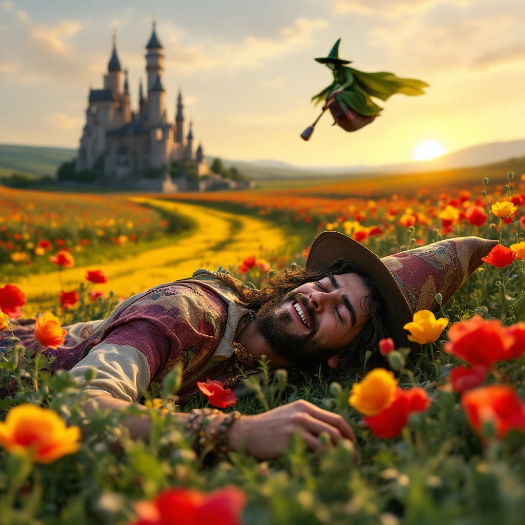 a totally wasted hippie with a dopey grin partly closed eyes is in a field of poppies laying prone on ground and talking a wizard next him, who is holding a bottle in front of him. the horizon has a yellow brick road leading to a castle in the distance, in the sky is a evil green witch flying on a hoover vacuum, trending on artstation , daz3d, cinema 3d, camera at a dynamic angle