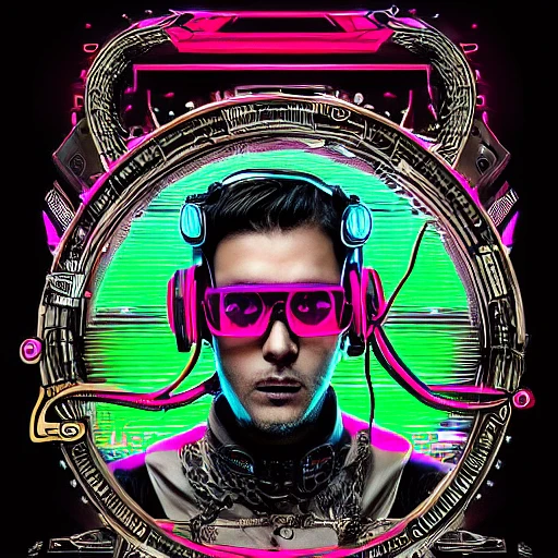nft style, cyberpunk, synthwave, tarot card with intricate detailed frame around the outside | with cyberglasses neon, and earphone, dj sound, futuristic, gold, diamond, side profile of cyberpunk body with cyborg skull | cyberpunk | styled in Art Nouveau | insanely detailed | embellishments | high definition | concept art | digital art | vibrant, hyperdetailed, intricate, kaleidoscope, extremely beautiful, ranking ligth, cinematic lighting, photo realistic, white background max detail, ranking ligth, cinematic lighting, photo realistic, by mandy jurgens, moebus, jon foster, alphonse mucha, glazing, pablo picasso, pinot noir, chiaroscuro, leonardo da vinci, Michelangelo, 8k