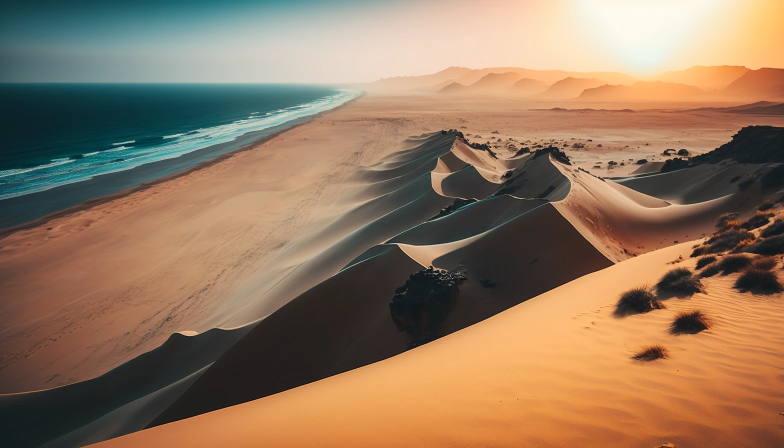 a panoramic shot of the desert and sea, by Jonathan Chng, Unsplash, cinematic, sandy dunes, blue waves, warm and cool tones, 4k, desaturated colors, wide aspect ratio, long shadows, lens flare, dramatic lighting --ar 16:9 --v 4 --q 2 --stylize 1000