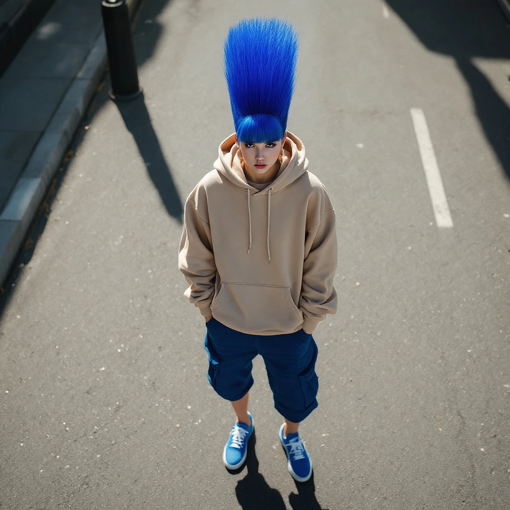 /imagine prompt: ultra-realistic top-down full-body photo of a young female model standing on an urban street, wearing an oversized beige hoodie, deep blue capri cargo pants, and modern blue sneakers. She has an exaggeratedly tall, voluminous hairdo styled straight upward in a rich cobalt blue color, resembling a towering beehive. The hair is sleek and tidy with defined texture, standing out as the focal point of her look. Dramatic sunlight casts sharp shadows on the pavement, highlighting the model and her unique hairstyle. Sharp focus, high-resolution DSLR aesthetic, richly detailed pavement and clothing textures --ar 9:16 --style raw --stylize 300 --no cartoon, 3D render, blurry, distorted anatomy, extra limbs, watermark, text