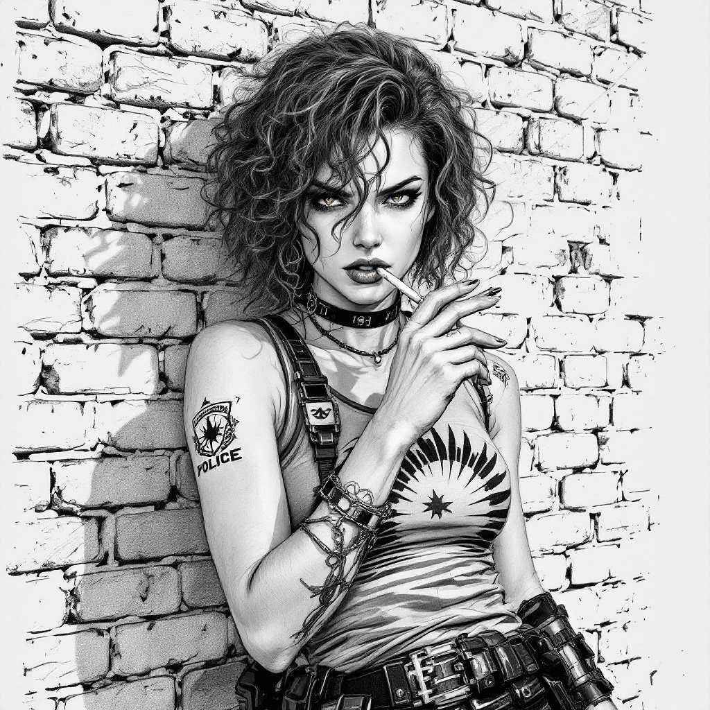 A very well done pencil sketch, just use some red color to give the main points of a full body cyberpunk female character, around the age of 20 leaning against a brick wall smoking a cigarette and looking away from the camera. They have an angry face. They should be wearing a police outfit a tank top with a 80s palm and sun design and heavy boots and their hair is reminiscent of makima from Chainsaw man, but curly hair. like malin akerman as laurie jupiter