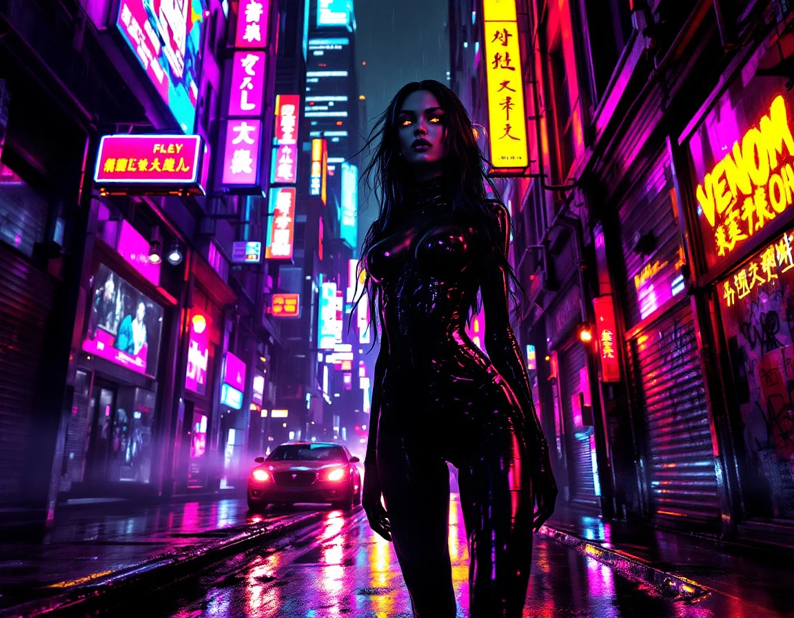 **Environment Description:** The setting is a dark, futuristic cityscape at night, illuminated by flickering neon lights and holographic billboards. Skyscrapers tower overhead, their glass facades reflecting the vibrant glow. The ground is slick with rain, creating shimmering puddles that mirror the neon hues. A narrow alleyway opens up, lined with graffiti and exposed pipes, giving a gritty yet electrifying atmosphere. Distant sirens echo, adding a sense of chaos and urgency. The scene is dynamic, with a moody, cyberpunk ambiance that emphasizes a blend of danger and allure. **First Female Venom:** Standing confidently on the left, she embodies a sleek, seductive predator. Her skin is a smooth, glossy black with subtle iridescent purple and green highlights that shimmer in the neon light. Her eyes are piercing, glowing amber with slit pupils, exuding intensity. Long, flowing jet-black hair cascades past her shoulders, slightly tousled by the wind. She wears a form-fitting, high-tech bodysuit made of a shiny, flexible material that contours her curves—cutouts at the sides reveal toned abs and hips. The suit features intricate, glowing circuit-like patterns that pulse subtly. She has long, sharp claws extending from her fingertips, and her posture is alluring yet dangerous, with a slight arch in her back and a confident gaze. **Second Female Venom:** Positioned on the right, she is more feral and dynamic. Her skin is a striking deep crimson with black web-like patterns spreading across her body, giving her a more aggressive appearance. Her eyes are glowing bright green, with a fierce, predatory glare. Her hair is wild, fiery red with streaks of black, styled into spiky, chaotic layers. She wears a revealing, armored corset-style top with jagged edges, paired with torn leather pants reinforced with metallic accents. Tendrils of symbiote material extend from her shoulders and arms, swirling in the air as if alive. Her stance is aggressive—slightly crouched, ready to spring—exuding raw power and sensual menace.