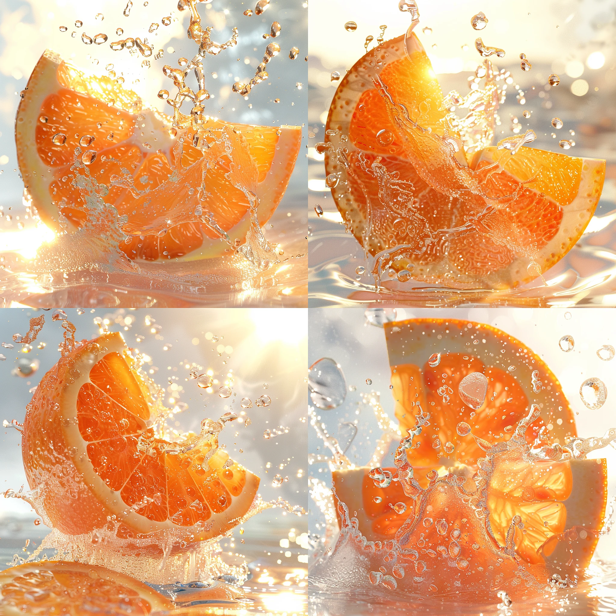 One golden grapefruit cut into pieces soaked in carbonated water, Cut Tangerine into small pieces, Summer ambiance, Sun, Surreal, Close-up, Macro, Ray Tracing, Pixar Trends, Sun Lighting, Depth of Field, highly detailed, commercial Photography, , white background, 8K