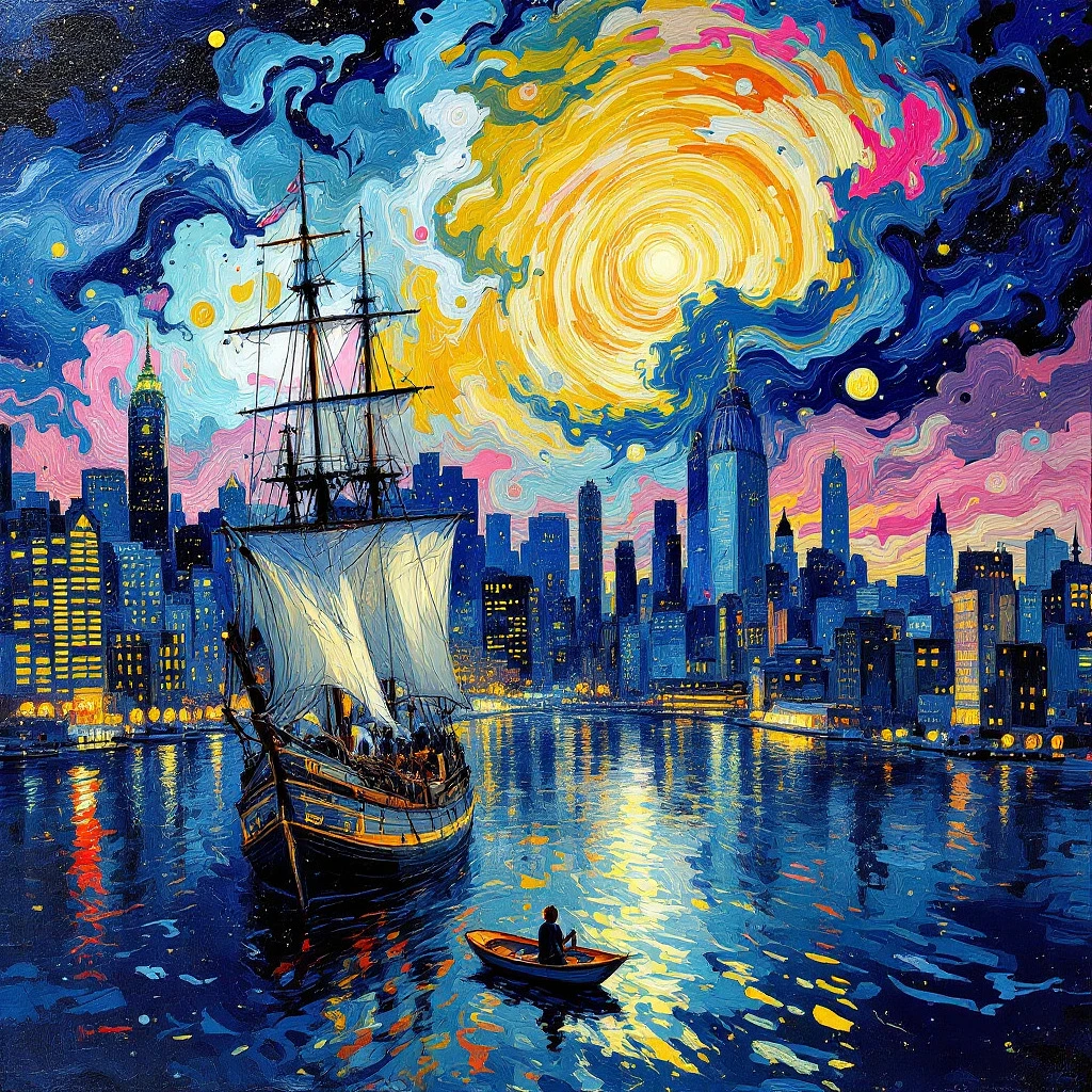 Psychedelic, Surreal. An oil painting with heavy brush strokes. painting of Manhattan as seen from a schooner lighting, low angle, trending on artstation, 4k, abstract, deep color, focused, extreme details, unreal engine 5, classic art, masterpiece, intricate artwork by Vincent Van Gogh