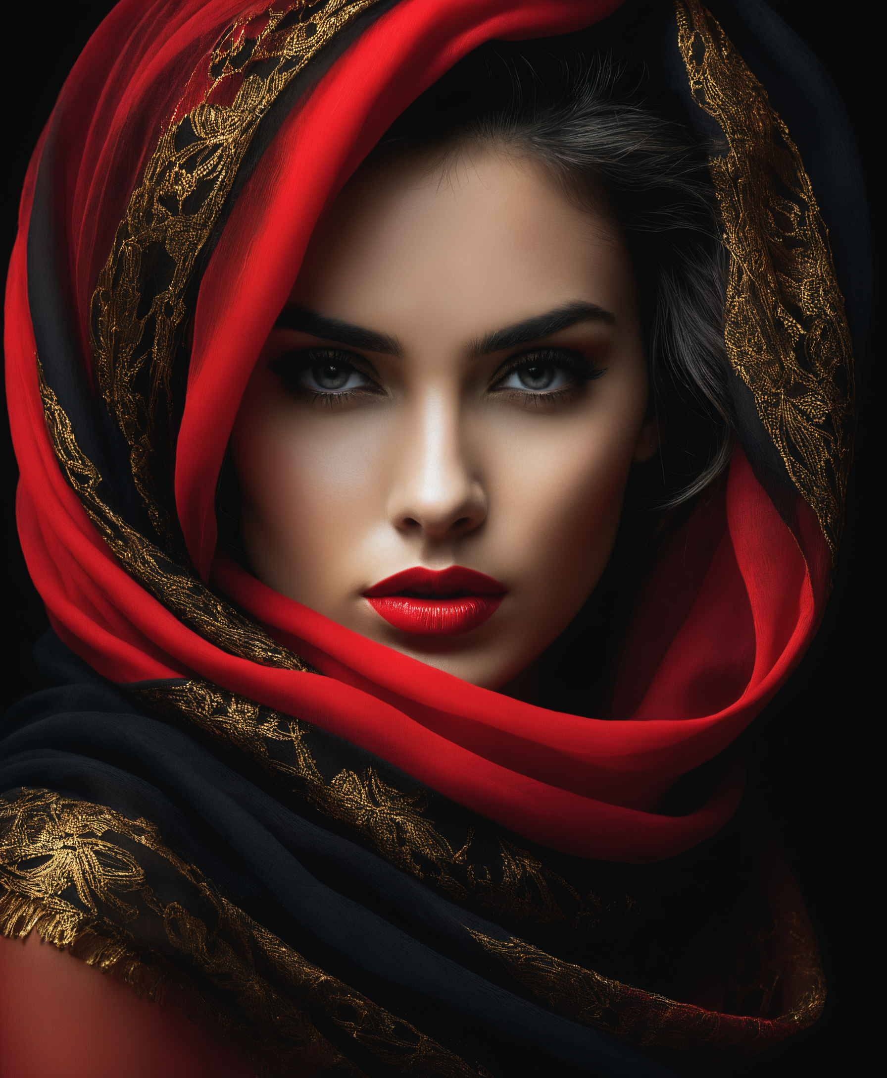 breathtaking portrait of a gorgeous girl, sultry, red scarf, dark gold and black, gossamer fabrics, jagged edges, eye-catching detail, insanely intricate, vibrant light and shadow textured background, captivating, negative white space