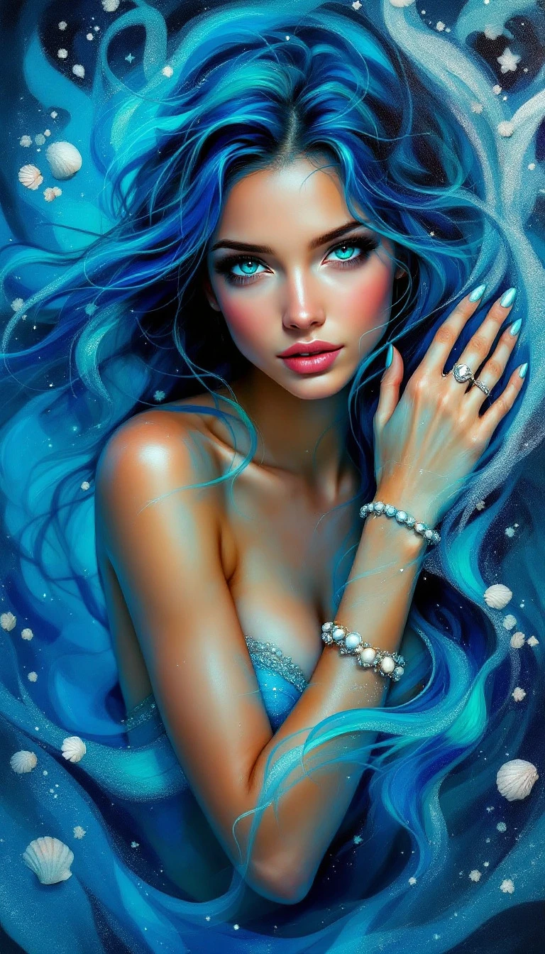 "Sapphire Siren in Ocean Depths": A mesmerizing abstract painting portrays the captivating beauty of a young woman, her presence both fluid and alluring. She is shown in an underwater realm, with her tan skin, long, flowing azure-blue hair, and shimmering, aquatic attire. She has delicate seashell bracelets around her wrists and hands. The artwork imaginatively blends abstract and realistic forms, creating a vibrant fusion of colors like deep blues, soft greens and luminous silvers. Her clear, emerald eyes, the artwork’s focal point, convey both mystery and an enticing grace. The flowing composition and deep hues invite the viewer to explore the hidden wonders within this enchanting painting, vibrant.