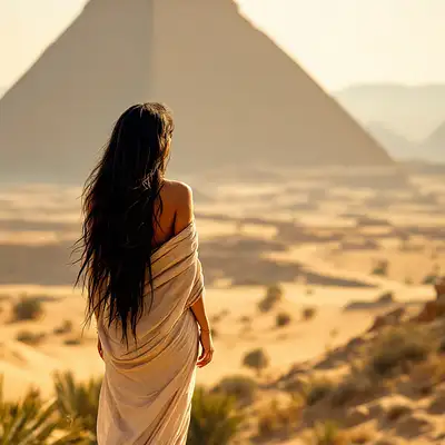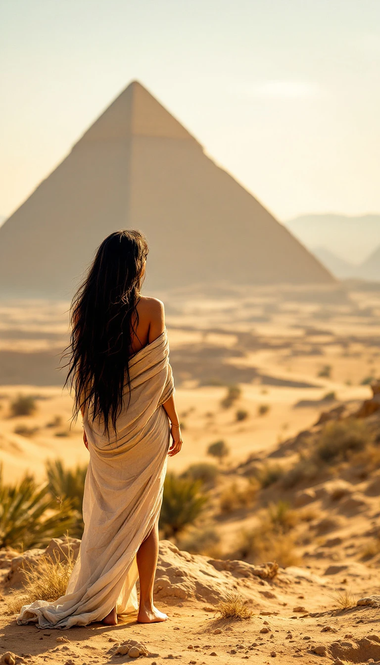 withthe pyramids and the nil valley on her backsa full body view hot egyptian girl, barefoot, show feet. she looks the lens