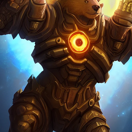cat is burried in a bear scifi armour, radiating a glowing aura global illumination ray tracing hdr fanart arstation, intricate, elegant, highly detailed, two arms, digital painting, artstation, concept art, matte, sharp focus, illustration, hearthstone, art by artgerm