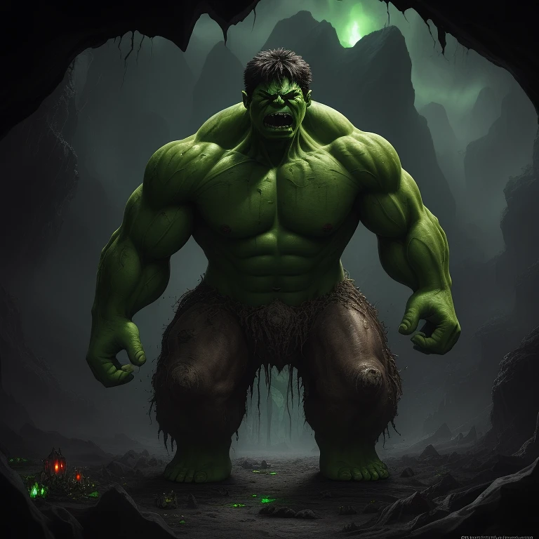 haunting creature that looks like a hulk, with, full body, reddish eyes, open wooden chest full of emeralds on the ground, cave in the background, horror, intricate details, cinematic, 4k, fantasy, digital art, photo, ((best quality) ), ((masterpiece) ), (high-resolution:1.2)